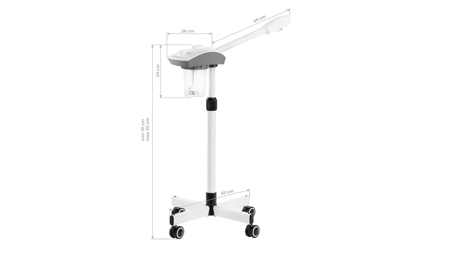 Négy gumis kerekének köszönhetően a kozmetikai gőzölő teljesen mobilis és könnyen mozgatható.